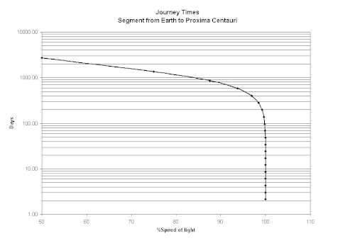 The following graph shows the journey times for twenty runs to Proxima Centauri from the ship viewpoint. Notice that as speeds approach the speed of light, the journey times reduce dramatically, even though the actual increments in speed appear slight. On the 20th run, at 1048575/1048576 of the speed of light, the distance shrinks to 0.0059 light-years and the traveller experiences a journey time of 2.15 days. Whereas to those on Earth the ship looks almost ‘frozen’ and the journey still takes 4.27 years, plus a couple of days.