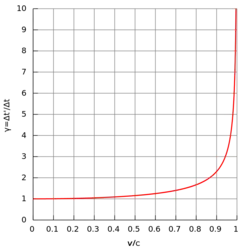 At v = 0, the magnitude of the Lorentz factor is At v = 0.5 c, the magnitude of the Lorentz factor is At v = 0.999 c, the magnitude of the Lorentz factor is Following this pattern, the spaceship will, after a finite time, turn into a beam of photons: