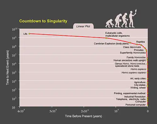 Having analyzed the timing of the events plotted on Ray Kurzweil's "Countdown to Singularity" graph, Andrey Korotayev arrived at the following best-fit equation: