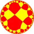 The icosidodecahedron exists in a sequence of symmetries of quasiregular polyhedra and tilings with vertex configurations (3.n)2, progressing from tilings of the sphere to the Euclidean plane and into the hyperbolic plane. With orbifold notation symmetry of *n32 all of these tilings are wythoff construction within a fundamental domain of symmetry, with generator points at the right angle corner of the domain.[7][8]