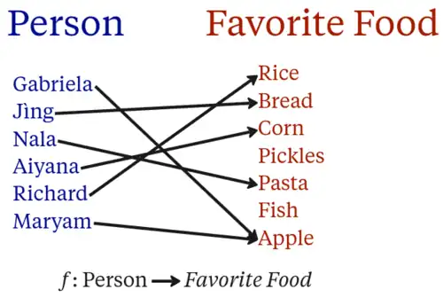 For the function that maps a Person to their Favorite Food, the image of Gabriela is Apple. The preimage of Apple is the set {Gabriela, Maryam}. The preimage of Fish is the empty set. The image of the subset {Richard, Maryam} is {Rice, Apple}. The preimage of {Rice, Apple} is {Gabriela, Richard, Maryam}.