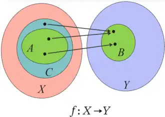 is a function from domain to codomain . The image of all elements in subset is subset . The preimage of is subset