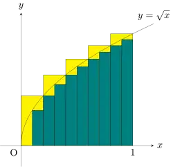 As another example, to find the area of the region bounded by the graph of the function f(x) = between x = 0 and x = 1, one can divide the interval into five pieces (0, 1/5, 2/5, ..., 1), then construct rectangles using the right end height of each piece (thus √0, √1/5, √2/5, ..., √1) and sum their areas to get the approximation