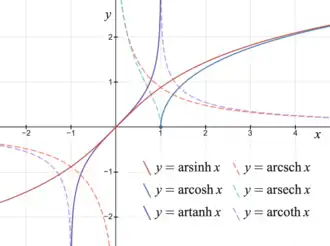 In mathematics, the inverse hyperbolic functions are inverses of the hyperbolic functions, analogous to the inverse circular functions. There are six in common use: inverse hyperbolic sine, inverse hyperbolic cosine, inverse hyperbolic tangent, inverse hyperbolic cosecant, inverse hyperbolic secant, and inverse hyperbolic cotangent. They are commonly denoted by the symbols for the hyperbolic functions, prefixed with arc- or ar- or with a superscript (for example arcsinh, arsinh, or ).