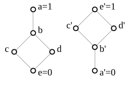 - ↑ The quantifiers are essential: for individual elements x, y, z, e.g. the first equation may be violated, but the second may hold; see the N5 lattice for an example.