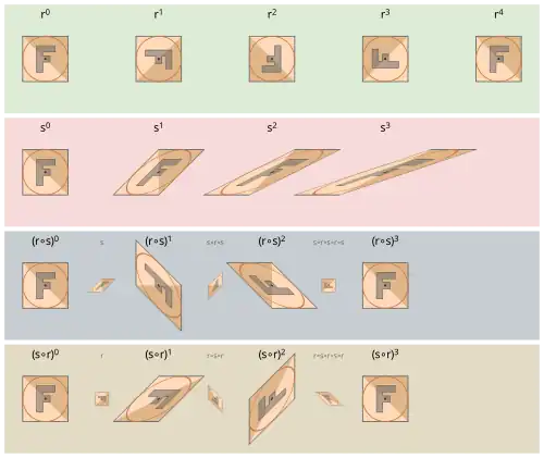 On top is a clockwise rotation by 90°. It has order 4, because that is the smallest positive exponent that produces the identity. Below is a shear mapping with infinite order.