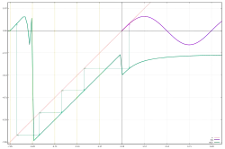 - ↑ For explicit instance, example 2 above amounts to just f n(x) = Ψ−1((ln 2)n Ψ(x)), for any n, not necessarily integer, where Ψ is the solution of the relevant Schröder's equation, Ψ(√2x) = ln 2 Ψ(x). This solution is also the infinite m limit of (f m(x) − 2)/(ln 2)m.