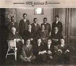 ![]() Left to right, standing: Frigyes Riesz, Béla Kerékjártó, Alfréd Haar, Dénes Kőnig, Rudolf Ortvay, on chairs: