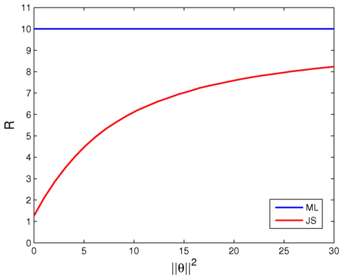 James and Stein showed that the above estimator dominates for any , meaning that the James–Stein estimator has a lower mean squared error (MSE) than the maximum likelihood estimator.[2][4] By definition, this makes the least squares estimator inadmissible when .