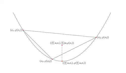 - ↑ Attention: In this generality additional assumptions on the convex function and/ or the topological vector space are needed, see Example (1.3) on p. 53 in Perlman, Michael D. (1974). "Jensen's Inequality for a Convex Vector-Valued Function on an Infinite-Dimensional Space". Journal of Multivariate Analysis. 4 (1): 52–65. doi:10.1016/0047-259X(74)90005-0. hdl:11299/199167.