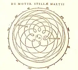 In 1621, Kepler published an expanded second edition of Mysterium, half as long again as the first, detailing in footnotes the corrections and improvements he had achieved in the 25 years since its first publication.[61] In terms of impact, the Mysterium can be seen as an important first step in modernizing the theory proposed by Copernicus in his De revolutionibus orbium coelestium. While Copernicus sought to advance a heliocentric system in this book, he resorted to Ptolemaic devices (viz., epicycles and eccentric circles) in order to explain the change in planets' orbital speed, and also continued to use as a point of reference the center of the Earth's orbit rather than that of the Sun "as an aid to calculation and in order not to confuse the reader by diverging too much from Ptolemy." Modern astronomy owes much to Mysterium Cosmographicum, despite flaws in its main thesis, "since it represents the first step in cleansing the Copernican system of the remnants of the Ptolemaic theory still clinging to it."[62] Kepler never abandoned his five solids theory, publishing the second edition of Mysterium in 1621 and affirming his continued belief in the validity of the model. Although he noted that there were discrepancies between the observational data and his model's predictions, he did not think they were large enough to invalidate the theory.[63]