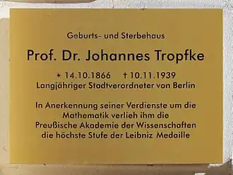 Tropfke was born in Berlin at Marienstraße 14 as the older of two sons of the cabinet maker Franz Tropfke. The house in which Tropfke was born was built by his grandfather Franz Joseph Tropfke around 1830 and is one of the few houses in the area that was not destroyed during World War II. Tropfke grew up in Berlin and after his graduation from the Friedrichs-Gymnasium (high school) in 1884 he attended the university in Berlin to study sciences and mathematics. In 1889 he was awarded a degree to teach math and sciences at gymnasiums (high schools). Later he earned a PhD in mathematics from the University of Halle for a thesis on elliptic integrals (Zur Darstellung des elliptischen Integrales erster Gattung), his advisor was Lazarus Fuchs.[1][2]