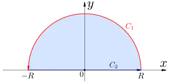 Jordan's lemma yields a simple way to calculate the integral along the real axis of functions f(z) = ei a z g(z) holomorphic on the upper half-plane and continuous on the closed upper half-plane, except possibly at a finite number of non-real points z1, z2, …, zn. Consider the closed contour C, which is the concatenation of the paths C1 and C2 shown in the picture. By definition,