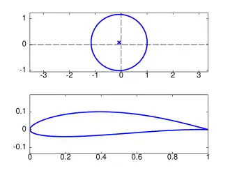 The Kármán–Trefftz transform is a conformal map closely related to the Joukowsky transform. While a Joukowsky airfoil has a cusped trailing edge, a Kármán–Trefftz airfoil—which is the result of the transform of a circle in the -plane to the physical -plane, analogue to the definition of the Joukowsky airfoil—has a non-zero angle at the trailing edge, between the upper and lower airfoil surface. The Kármán–Trefftz transform therefore requires an additional parameter: the trailing-edge angle This transform is[2][3]
