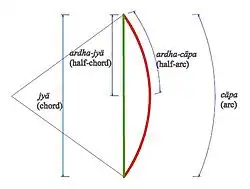 An arc of a circle is like a bow and so is called a dhanu or chāpa which in Sanskrit means "a bow". The straight line joining the two extremities of an arc of a circle is like the string of a bow and this line is a chord of the circle. This chord is called a jyā which in Sanskrit means "a bow-string", presumably translating Hipparchus's χορδή with the same meaning. The word jīvá is also used as a synonym for jyā in geometrical literature.[2] At some point, Indian astronomers and mathematicians realised that computations would be more convenient if one used the halves of the chords instead of the full chords and associated the half-chords with the halves of the arcs.[1][3] The half-chords were called ardha-jyās or jyā-ardhas. These terms were again shortened to jyā by omitting the qualifier ardha which meant "half of".