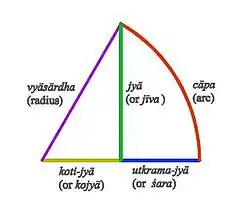 Jyā, koṭi-jyā and utkrama-jyā are three trigonometric functions introduced by Indian mathematicians and astronomers. The earliest known Indian treatise containing references to these functions is Surya Siddhanta.[1] These are functions of arcs of circles and not functions of angles. Jyā and koti-jyā are closely related to the modern trigonometric functions of sine and cosine. In fact, the origins of the modern terms of "sine" and "cosine" have been traced back to the Sanskrit words jyā and koti-jyā.[1]