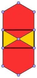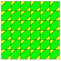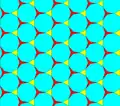 A related three dimensional structure formed by the vertices and edges of the quarter cubic honeycomb, filling space by regular tetrahedra and truncated tetrahedra, has been called a hyper-kagome lattice.[8] It is represented by the vertices and edges of the quarter cubic honeycomb, filling space by regular tetrahedra and truncated tetrahedra. It contains four sets of parallel planes of points and lines, each plane being a two dimensional kagome lattice. A second expression in three dimensions has parallel layers of two dimensional lattices and is called an orthorhombic-kagome lattice.[8] The trihexagonal prismatic honeycomb represents its edges and vertices.