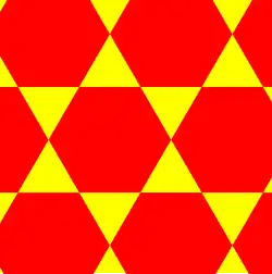 There are two distinct uniform colorings of a trihexagonal tiling. Naming the colors by indices on the 4 faces around a vertex (3.6.3.6): 1212, 1232.[1] The second is called a cantic hexagonal tiling, h2{6,3}, with two colors of triangles, existing in p3m1 (*333) symmetry.