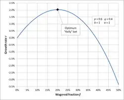 In a system where the return on an investment or a bet is binary, so an interested party either wins or loses a fixed percentage of their bet, the expected growth rate coefficient yields a very specific solution for an optimal betting percentage.