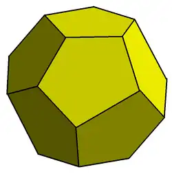 The Weaire–Phelan structure differs from Kelvin's in that it uses two kinds of cells, although they have equal volume. Like the cells in Kelvin's structure, these cells are combinatorially equivalent to convex polyhedra. One is a pyritohedron, an irregular dodecahedron with pentagonal faces, possessing tetrahedral symmetry (Th). The second is a form of truncated hexagonal trapezohedron, a species of tetrakaidecahedron with two hexagonal and twelve pentagonal faces, in this case only possessing two mirror planes and a rotoreflection symmetry. Like the hexagons in the Kelvin structure, the pentagons in both types of cells are slightly curved. The surface area of the Weaire–Phelan structure is 0.3% less than that of the Kelvin structure.[1]
