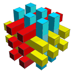The tetrakaidecahedron cells, linked up in face-to-face chains of cells along their hexagonal faces, form chains in three perpendicular directions. A combinatorially equivalent structure to the Weaire–Phelan structure can be made as a tiling of space by unit cubes, lined up face-to-face into infinite square prisms in the same way to form a structure of interlocking prisms called tetrastix. These prisms surround cubical voids which form one fourth of the cells of the cubical tiling; the remaining three fourths of the cells fill the prisms, offset by half a unit from the integer grid aligned with the prism walls. Similarly, in the Weaire–Phelan structure itself, which has the same symmetries as the tetrastix structure, 1/4 of the cells are dodecahedra and 3/4 are tetrakaidecahedra.[10]