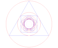 In plane geometry, the Kepler–Bouwkamp constant (or polygon inscribing constant) is obtained as a limit of the following sequence. Take a circle of radius 1. Inscribe a regular triangle in this circle. Inscribe a circle in this triangle. Inscribe a square in it. Inscribe a circle, regular pentagon, circle, regular hexagon and so forth. The radius of the limiting circle is called the Kepler–Bouwkamp constant.[1] It is named after Johannes Kepler and Christoffel Bouwkamp, and is the inverse of the polygon circumscribing constant.