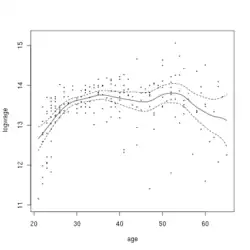 The figure to the right shows the estimated regression function using a second order Gaussian kernel along with asymptotic variability bounds.