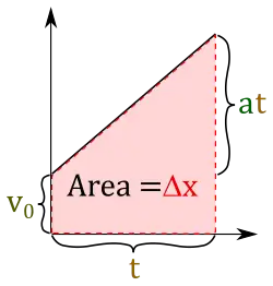 We can take by adding the top area and the bottom area. The bottom area is a rectangle, and the area of a rectangle is the where is the width and is the height. In this case and (the here is different from the acceleration ). This means that the bottom area is . Now let's find the top area (a triangle). The area of a triangle is where is the base and is the height.[22] In this case, and or . Adding and results in the equation results in the equation .[23] This equation is applicable when the final velocity v is unknown.