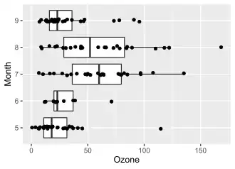on daily readings of ozone for May 1 to September 30, 1973, in New York City. The data are in the R data set airquality, and the analysis is included in the documentation for the R function kruskal.test. Boxplots of ozone values by month are shown in the figure.