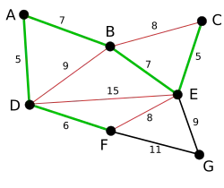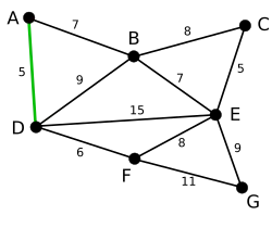 The next-shortest edges are AB and BE, both with length 7. AB is chosen arbitrarily, and is highlighted. The edge BD has been highlighted in red, because there already exists a path (in green) between B and D, so it would form a cycle (ABD) if it were chosen. |