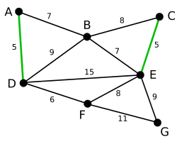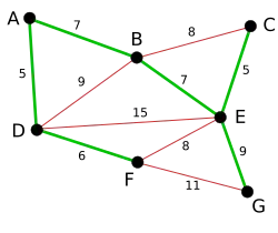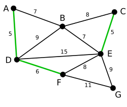 Kruskal's algorithm[1] finds a minimum spanning forest of an undirected edge-weighted graph. If the graph is connected, it finds a minimum spanning tree. It is a greedy algorithm that in each step adds to the forest the lowest-weight edge that will not form a cycle.[2] The key steps of the algorithm are sorting and the use of a disjoint-set data structure to detect cycles. Its running time is dominated by the time to sort all of the graph edges by their weight.