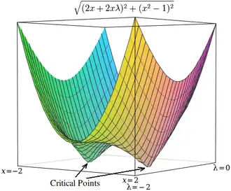 The critical points of Lagrangians occur at saddle points, rather than at local maxima (or minima).[4][17] Unfortunately, many numerical optimization techniques, such as hill climbing, gradient descent, some of the quasi-Newton methods, among others, are designed to find local maxima (or minima) and not saddle points. For this reason, one must either modify the formulation to ensure that it's a minimization problem (for example, by extremizing the square of the gradient of the Lagrangian as below), or else use an optimization technique that finds stationary points (such as Newton's method without an extremum seeking line search) and not necessarily extrema.