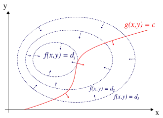 In mathematical optimization, the method of Lagrange multipliers is a strategy for finding the local maxima and minima of a function subject to equation constraints (i.e., subject to the condition that one or more equations have to be satisfied exactly by the chosen values of the variables).[1] It is named after the mathematician Joseph-Louis Lagrange.