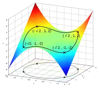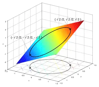Applying the ordinary Lagrange multiplier method yields from which the gradient can be calculated: And therefore: (iii) is just the original constraint. (i) implies or If then by (iii) and consequently from (ii). If substituting this into (ii) yields Substituting this into (iii) and solving for gives Thus there are six critical points of