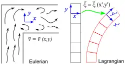 The Eulerian specification of the flow field is a way of looking at fluid motion that focuses on specific locations in the space through which the fluid flows as time passes.[1][2] This can be visualized by sitting on the bank of a river and watching the water pass the fixed location.