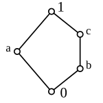 ![]() Pic. 11: Smallest non-modular (and hence non-distributive) lattice N5. , but and , so the modular law is violated. The labelled elements also violate the distributivity equation but satisfy its dual |