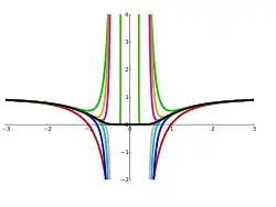 Consider for instance the function with . As a real function, it is infinitely differentiable everywhere; as a complex function however it is not differentiable at . The Laurent series of is obtained via the power series representation, which converges to for all except at the singularity . The graph on the right shows in black and its Laurent approximations As , the approximation becomes exact for all (complex) numbers except at the singularity .