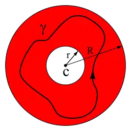 The path of integration is counterclockwise around a Jordan curve enclosing and lying in an annulus in which is holomorphic (analytic). The expansion for will then be valid anywhere inside the annulus. The annulus is shown in red in the figure on the right, along with an example of a suitable path of integration labeled . When is defined as the circle , where , this amounts to computing the complex Fourier coefficients of the restriction of to .[4] The fact that these integrals are unchanged by a deformation of the contour is an immediate consequence of Green's theorem.