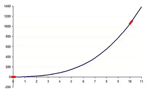 Graph of y = x3 + 5x + 0.1. The leading order, or main, behaviour at x = 0.001 is that y is constant, and at x = 10 is that y increases cubically with x.