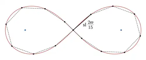 Later mathematicians generalized this result. Analogously to the constructible polygons in the circle, the lemniscate can be divided into n sections of equal arc length using only straightedge and compass if and only if n is of the form where k is a non-negative integer and each pi (if any) is a distinct Fermat prime.[34] The "if" part of the theorem was proved by Niels Abel in 1827–1828, and the "only if" part was proved by Michael Rosen in 1981.[35] Equivalently, the lemniscate can be divided into n sections of equal arc length using only straightedge and compass if and only if is a power of two (where is Euler's totient function). The lemniscate is not assumed to be already drawn, as that would go against the rules of straightedge and compass constructions; instead, it is assumed that we are given only two points by which the lemniscate is defined, such as its center and radial point (one of the two points on the lemniscate such that their distance from the center is maximal) or its two foci.