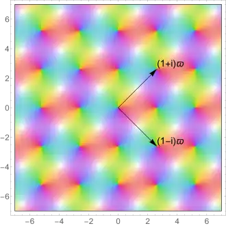 This makes them elliptic functions (doubly periodic meromorphic functions in the complex plane) with a diagonal square period lattice of fundamental periods and .[14] Elliptic functions with a square period lattice are more symmetrical than arbitrary elliptic functions, following the symmetries of the square.