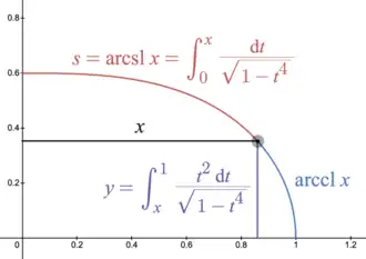 The inverse lemniscate sine also describes the arc length s relative to the x coordinate of the rectangular elastica.[36] This curve has y coordinate and arc length: