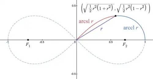 Or in the inverse direction, the lemniscate sine and cosine functions give the distance from the origin as functions of arc length from the origin and the point , respectively.