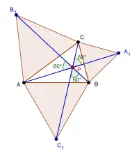- If on the three sides of an arbitrary triangle one describes equilateral triangles then the line segments are equal, they concur in a point P, and the angles they form one another are equal to 60°.