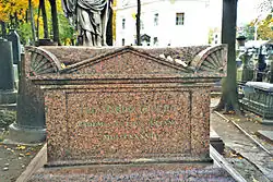 Euler was buried next to Katharina at the Smolensk Lutheran Cemetery on Vasilievsky Island. In 1837, the Russian Academy of Sciences installed a new monument, replacing his overgrown grave plaque. In 1957, to commemorate the 250th anniversary of his birth, his tomb was moved to the Lazarevskoe Cemetery at the Alexander Nevsky Monastery.[70]