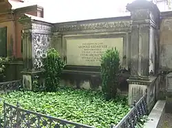 His philosophical view of mathematics put him in conflict with several mathematicians over the years, notably straining his relationship with Weierstrass, who almost decided to leave the university in 1888.[4] Kronecker died on 29 December 1891 in Berlin, several months after the death of his wife. In the last year of his life, he converted to Christianity.[3] He is buried in the Alter St Matthäus Kirchhof cemetery in Berlin-Schöneberg, close to Gustav Kirchhoff.
