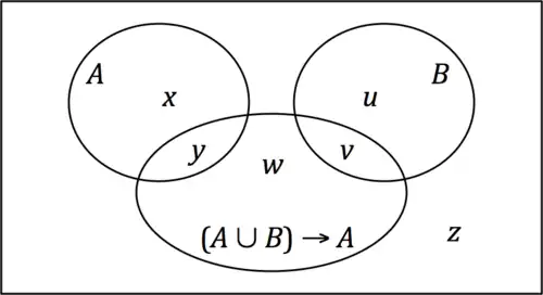 A graphical version of the proof starts with Fig. 2, where the and from Fig. 1 are now disjoint and has been replaced by .[3] By the assumption that and are possible, and . By the assumption that together and do not together exhaust all possibilities, . And by the new constraint on probability functions, , which means that