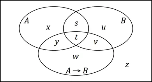 - ↑ Reading "If , then " as "Not , unless also " makes compounding straightforward, since becomes equivalent to the Boolean expression . However, this has the unsatisfactory consequence that ; then "If , then " is assigned high probability whenever is highly unlikely, even if 's occurrence would make highly unlikely. This is a version of what in logic is called a paradox of material implication.