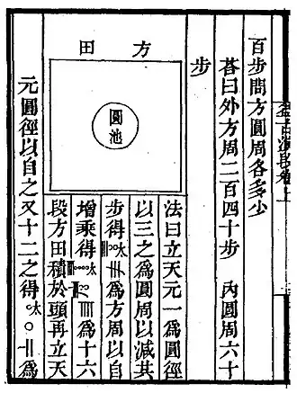 Ceyuan haijing (Sea mirror of circle measurements) is a collection of 170 problems, all related to the same example of a circular city wall inscribed in a right triangle and a square.[1][9] They often involve two people who walk on straight lines until they can see each other, meet or reach a tree in a certain spot. The purpose of book was to study intricate geometrical relations with algebra and provide solutions to equations.[10]