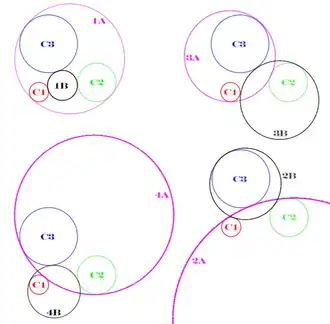 The incidence of cycles in Lie sphere geometry provides a simple solution to the problem of Apollonius.[3] This problem concerns a configuration of three distinct circles (which may be points or lines): the aim is to find every other circle (including points or lines) which is tangent to all three of the original circles. For a generic configuration of circles, there are at most eight such tangent circles.